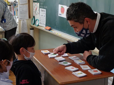 始めに、絵本とカードを使って、フルーツの言い方を復習して・・・