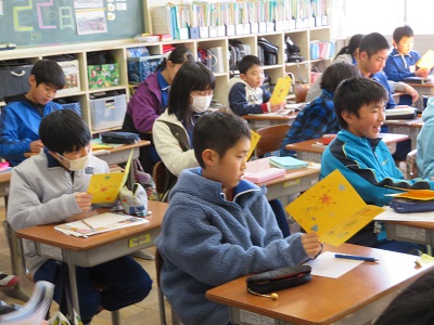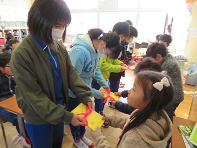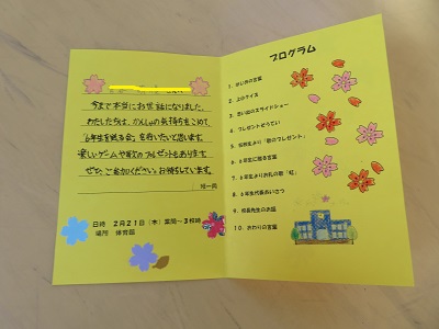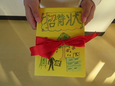 今年の招待状は、3年生がイラストを描きました。なかよし班ごとにリボンでまとめ、6年生の代表に渡しました。招待状を手にした6年生は、とても嬉しそうに見ていました。