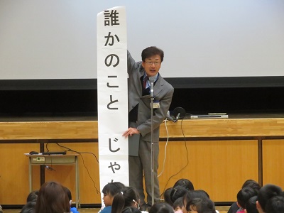 校長先生からは、人権について、「だれか」のことじゃない、「自分のこと」として考えて欲しいとお話がありました。「相手の気持ちを思いやること」「相手の心の痛みがわかること」大切にしてください、とおっしゃっていました。