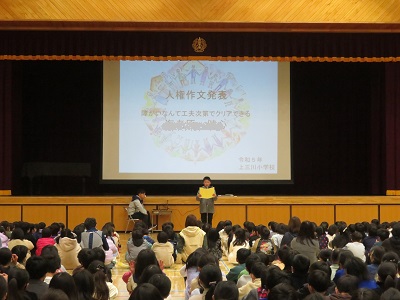 人権作文の審査で、優秀賞になった6年児童が、作文を読みました。