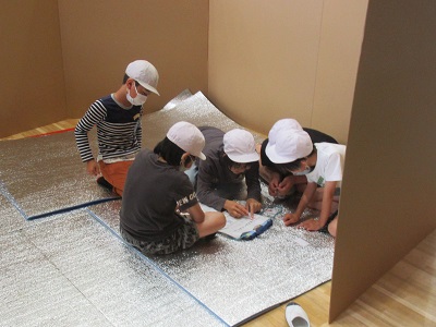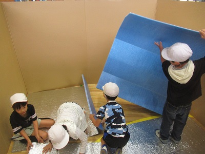 段ボールやアルミシートを広げ、家族で過ごす部屋を作りました。
