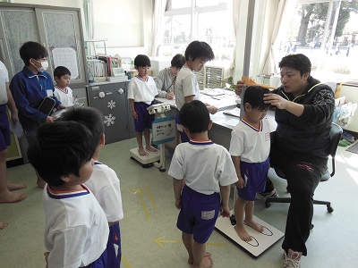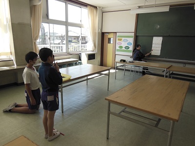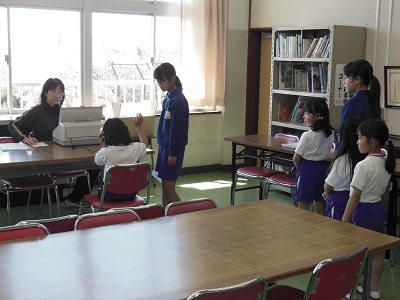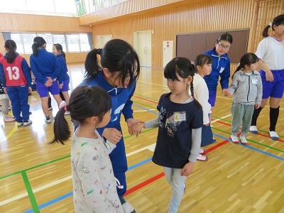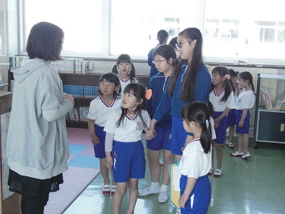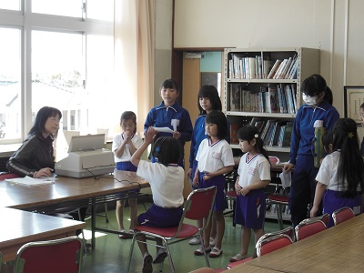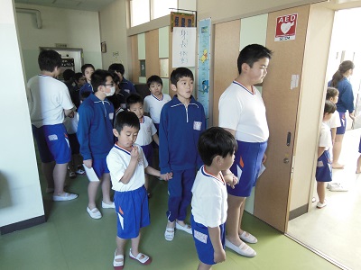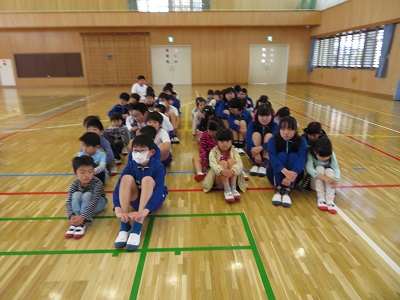 朝のうちに体育館に集まり、一緒に回る1年生と6年生のペアの確認をしました。6年生が1年生の手をしっかり握り、移動したり説明を聞いたりしていました。
