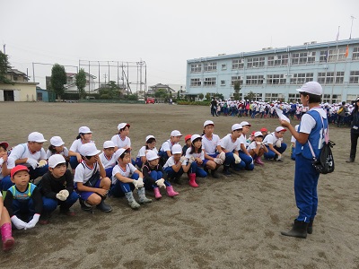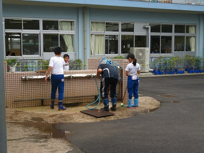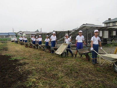 農園委員会の児童は、一輪車などの道具を片付けたり汚れた水道をきれいにしたりしました。