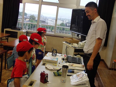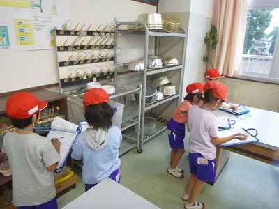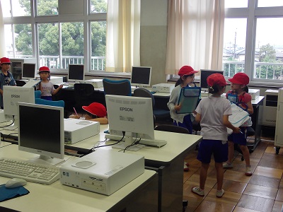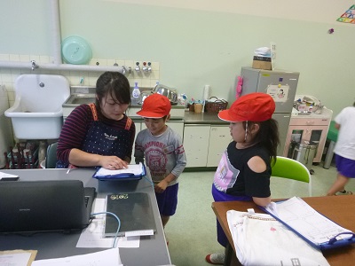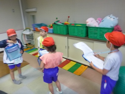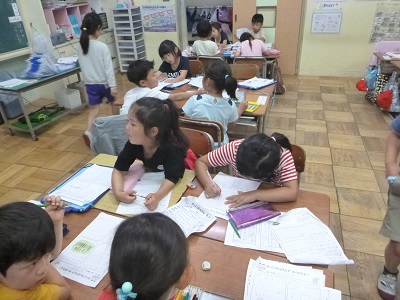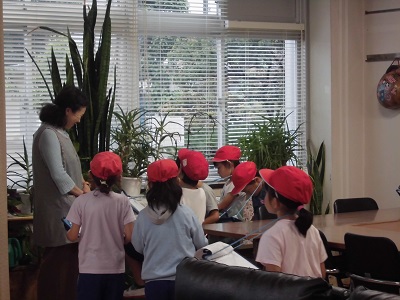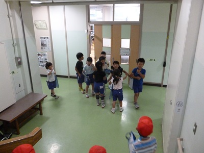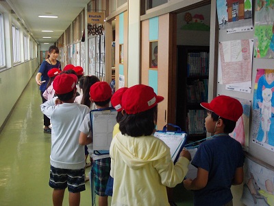 地図を片手に、グループのお友達と協力して、校舎の中を探検しました。先生方に会うと、サインをもらっていました。廊下で出会った先生には、「パソコン室どこですか?」「お料理するお部屋はどこですか?」と、しっかり質問できました。教室に戻ると、探検したことを、絵や言葉でまとめました。