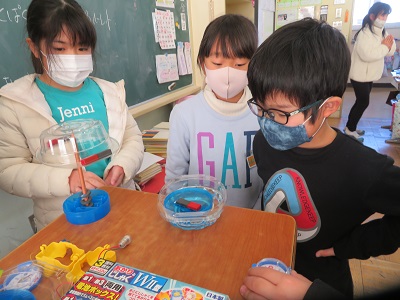 同じ極同士は反発しあう、違う極はくっつくという磁石の特性を生かして、くるくる回るおもちゃや飛び出すおもちゃを作ることができました。