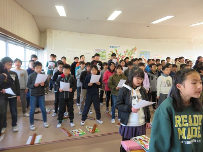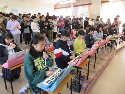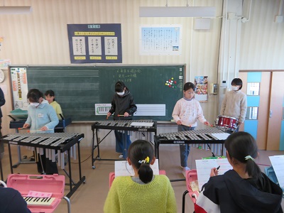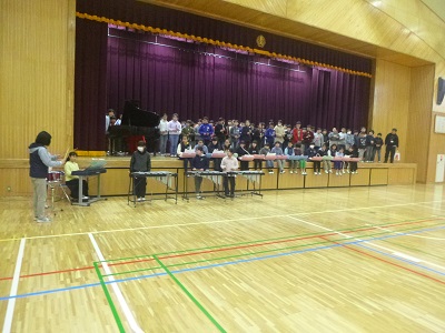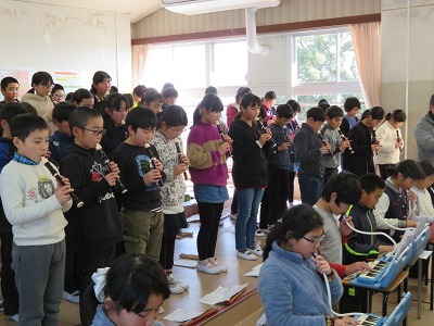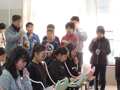 音楽室で、6年生が退場するときに演奏する曲や歌の練習をしました。