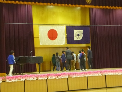 体育館ステージの演台をしまい、国旗と町旗、いすを片付けました。