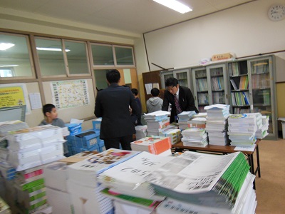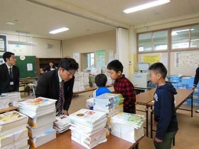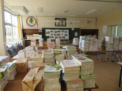 新しい学年で使う教科書が児童会議室に山積みになっていました。