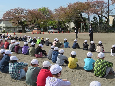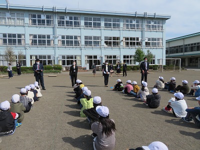 下学年が教室へ入った後、上学年は校庭で学年集会をしていました。