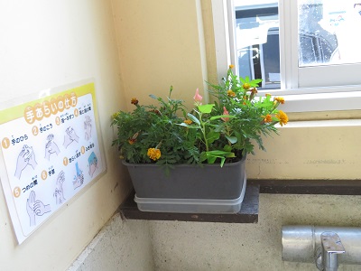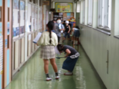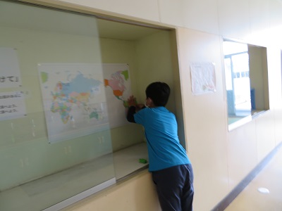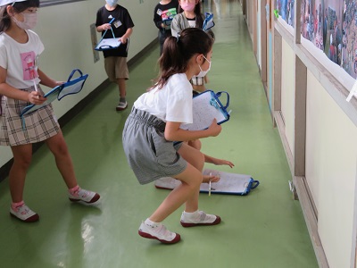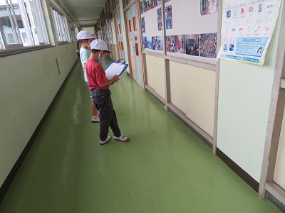 梅雨の季節に雨が続いても校内で楽しく過ごせるように、壁に貼った「かえる」を探す活動を行いました。