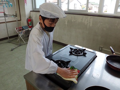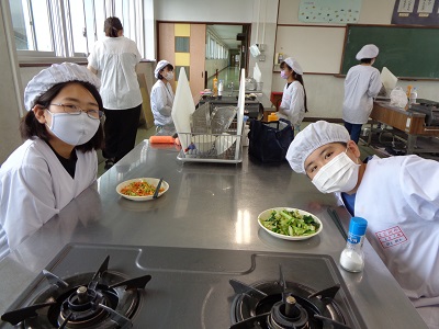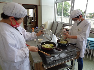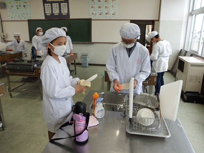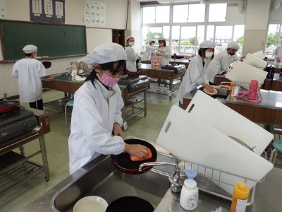 調理は黙って一人ずつ行いましたが、片付けはペアで協力して行いました。GWにフライパンの使い方を練習してきたことと、食生活改善推進員さんのサポートもあり、安全かつスムーズに調理実習を終えることができました。