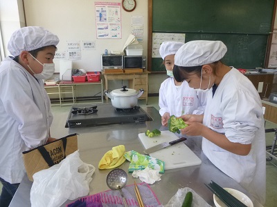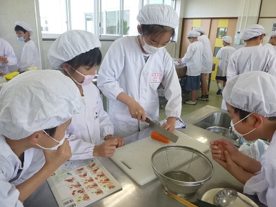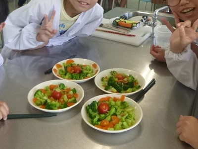 5年生が、調理実習で、ゆで野菜サラダを作りました。