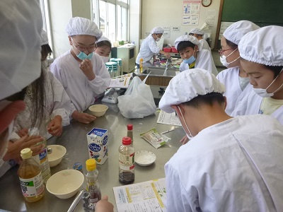 ソース(ドレッシング)も、酢や油、塩などを計って、よく混ぜ、自分達で作りました。