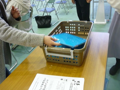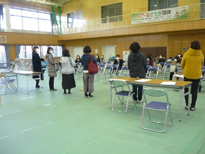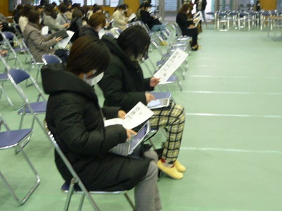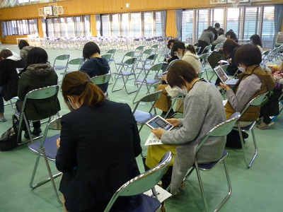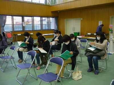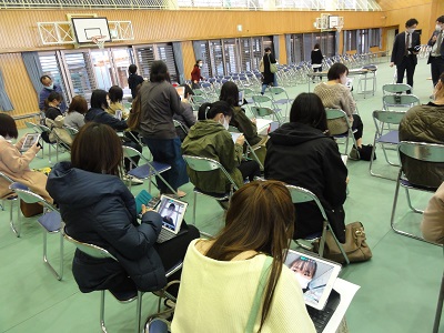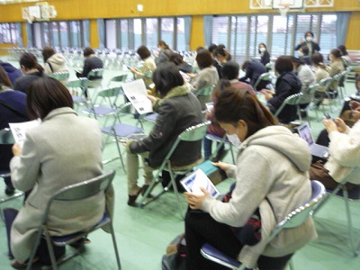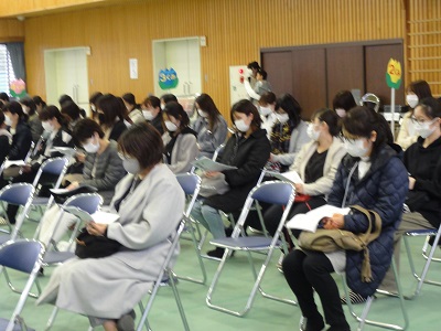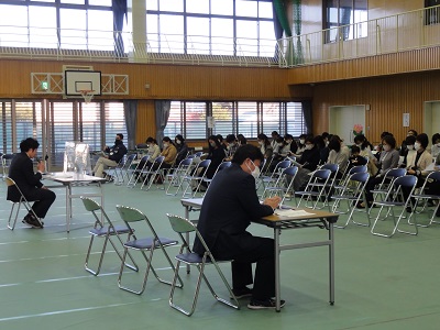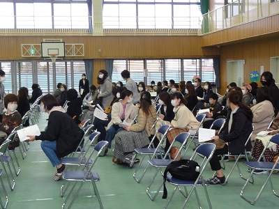 保護者の方々には、消毒をしてからクラスごとに座ってもらいました。