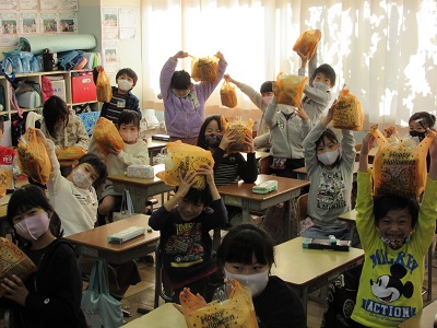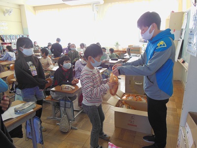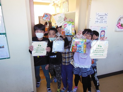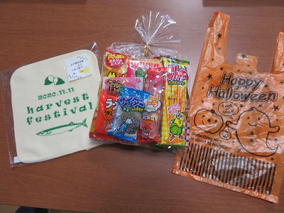 例年のように、おじいちゃん、おばあちゃん、見守り隊の皆さんを招待しての収穫祭はできませんでしたが、「楽しい行事がなくなってしまった子供たちに笑顔を!!」という思いで、上小地区社会福祉協議会の皆さんが考えてくれたイベントが行われました。