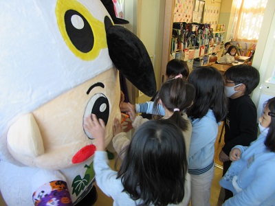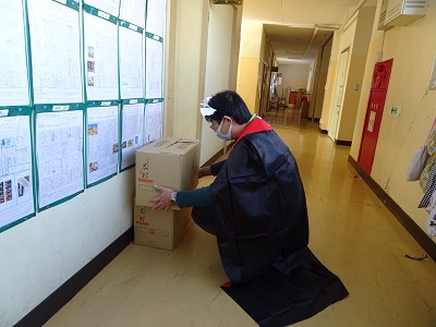 子供たちが映像を見ている頃、ハロウィンの仮装をした上小地区社協の方が、教室の廊下にプレゼントを運んでくれました。