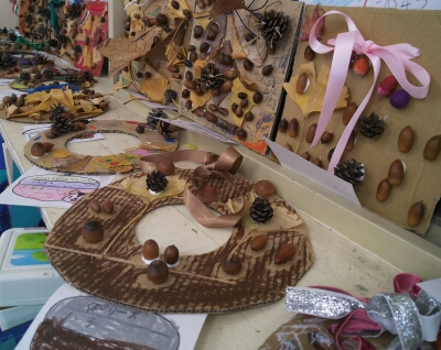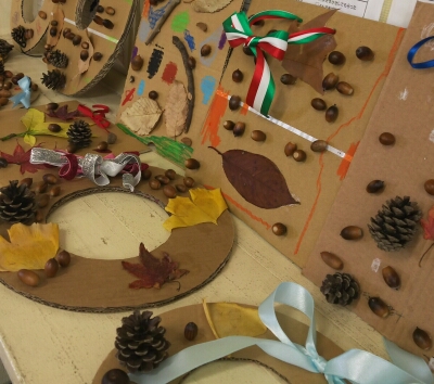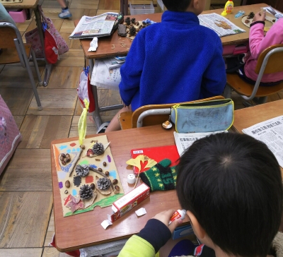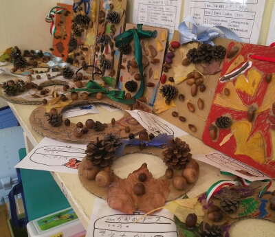 先日拾ってきた落ち葉やドングリ等を使って、リース作りを行いました。
