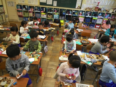 どこに何を貼ろうかと、楽しみながらリース作りを行っていました。