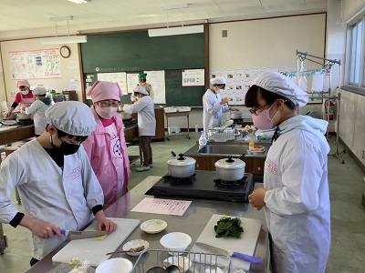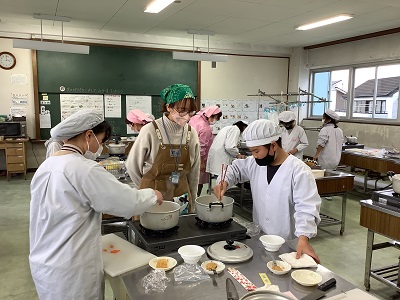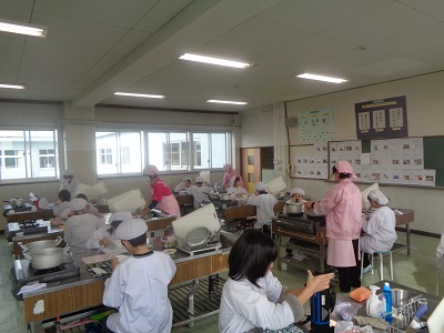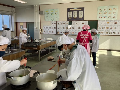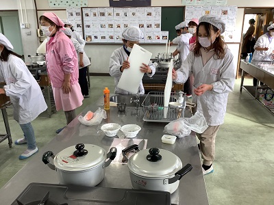 今回の実習では、食生活改善推進員の皆さんにお手伝いいただき、煮干しを使って「だし」をとるところから実践しました。