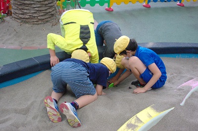 「砂場の底が見てみたい!」と協力して砂をかき分けています。