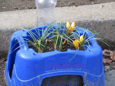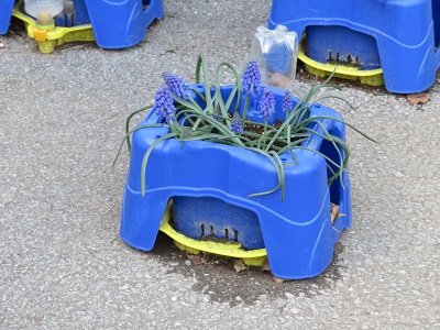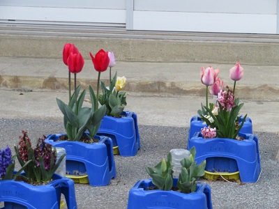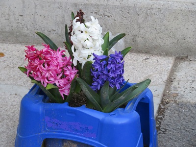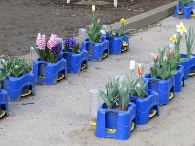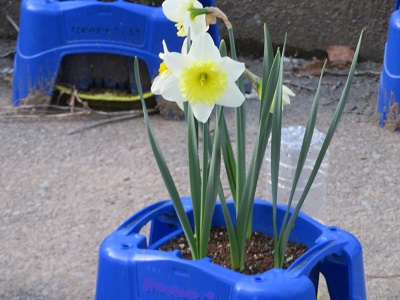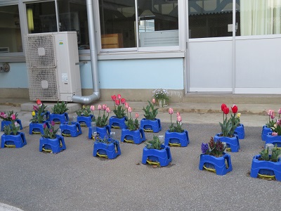 新2年生が植木鉢に植えた球根が、様々な花を咲かせています。