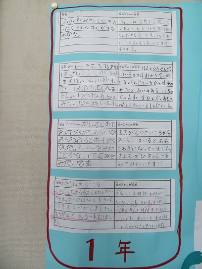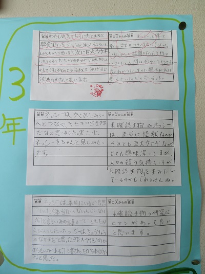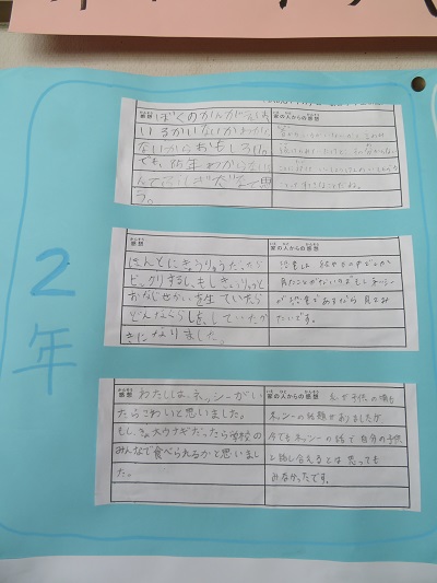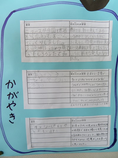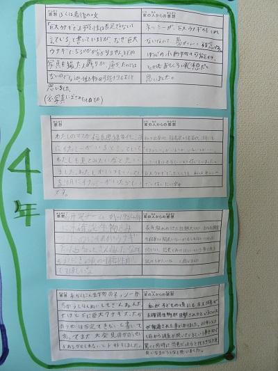 各クラスから出してもらった感想を、図書ボランティアの方が掲示してくれました。