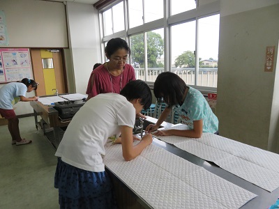 もう一部屋では、布の印付け。先生は、両方の部屋を行き来して、様子を見ながら指導をすることができ、とても助かりました。