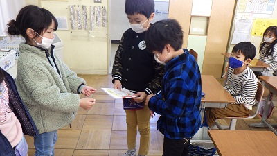 12月中旬に行った生活科「おもちゃまつり」のお礼として、1年生から心のこもったプレゼントをもらいました。