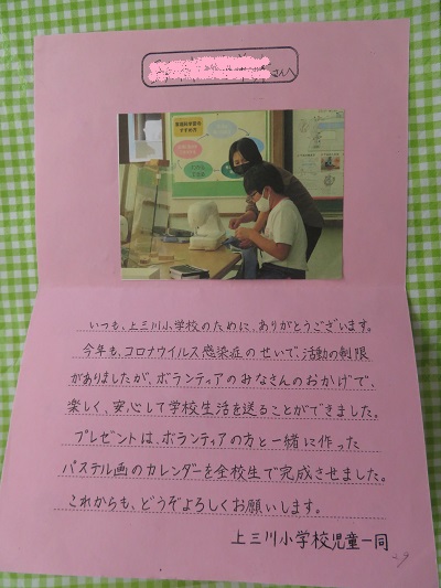 児童からのお礼のお手紙は、6年生が下書きをし、4年生が色を塗り、再び6年生がボランティアの方のお名前を書いて、写真を貼りました。