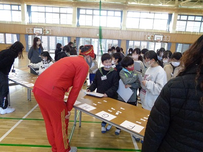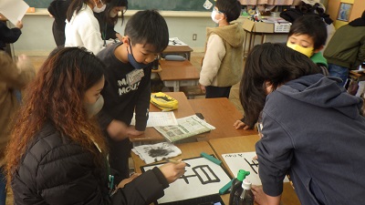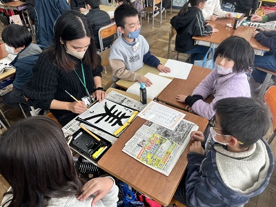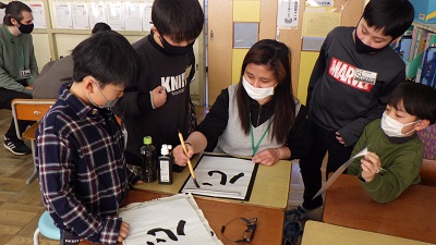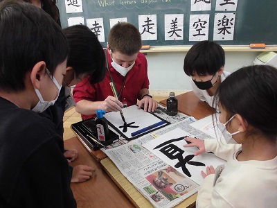 3年生は習字を行いました。習字のやり方や漢字の書き順を英語やジェスチャーを使って教えました。