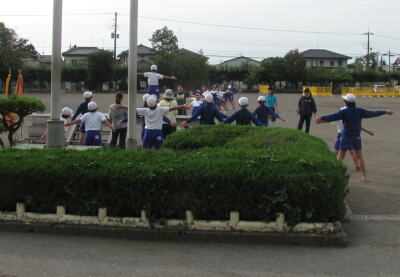 前に出てラジオ体操を行う児童は、左右逆の動きで練習をしています。