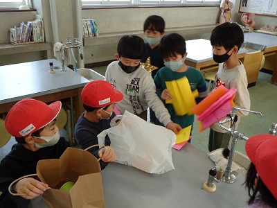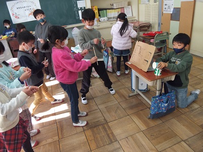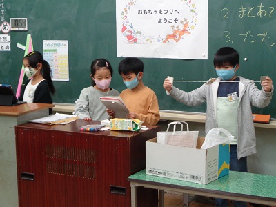 クラスごとに1年生をおもちゃまつりに招待し、交流しました。