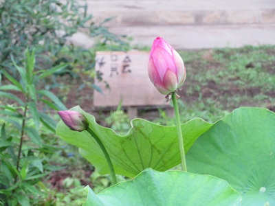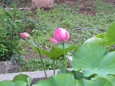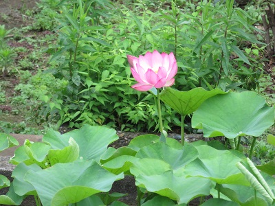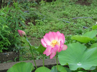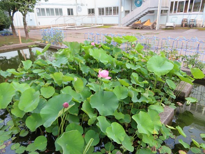 学校に来た際には、ぜひ、中庭に立ち寄り、すてきな蓮の花とその周りを泳ぐメダカを、見て行って下さい。心が和みますよ。