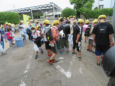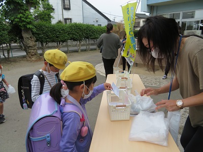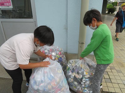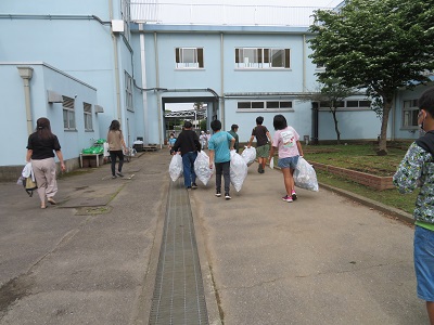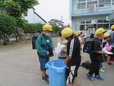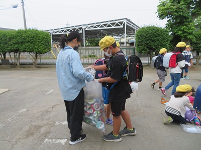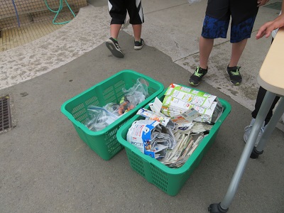 環境整美委員会の児童が、積極的にかごに入れるお手伝いをします。