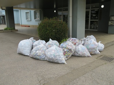 集まったアルミ缶を袋にまとめ、西門の辺りに運びます。