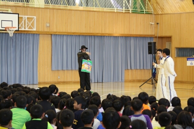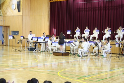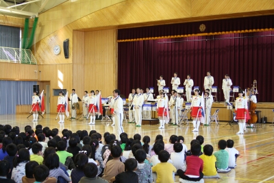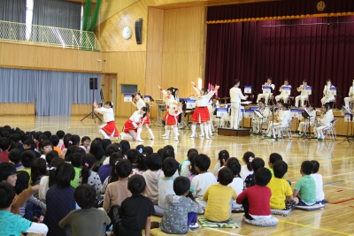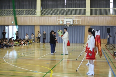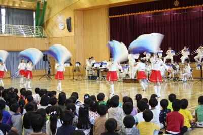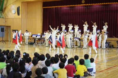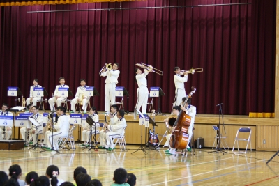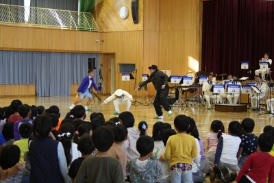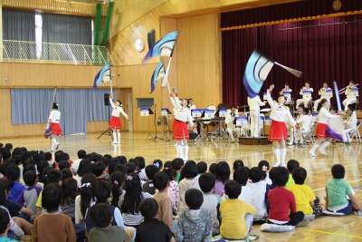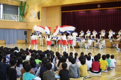 音楽鑑賞教室で栃木県警の警察音楽隊とカラーガード隊の皆さんが上三川小学校にやってきました。