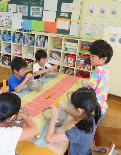 かがやき学級でできたポップコーンを料理して、栽培の指導をしていただいた地域の方に届け、お礼を言いました。