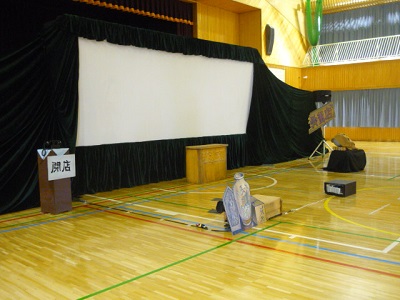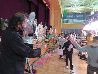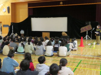 低学年にとって、体育館で見る初めての演劇教室は、「ゲゲゲの鬼太郎」影絵です。