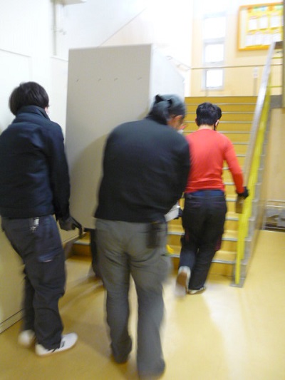 2,3階の教室には、4人がかりで運んでいきます。