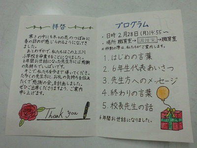 招待状はこのような感じです。6年生の代表がかいたイラストも文字も美しく、多くの先生方からお褒めの言葉をいただきました。