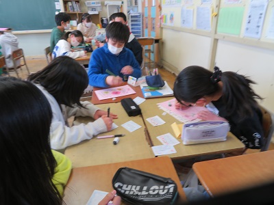 1年間、なかよし班活動でお世話になった先生に、招待状やメッセージカードを作っているときの様子です。みんな真剣な表情です。