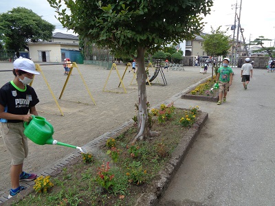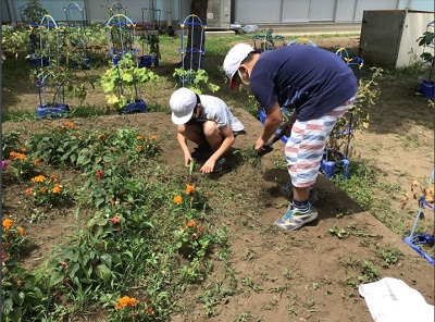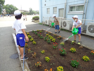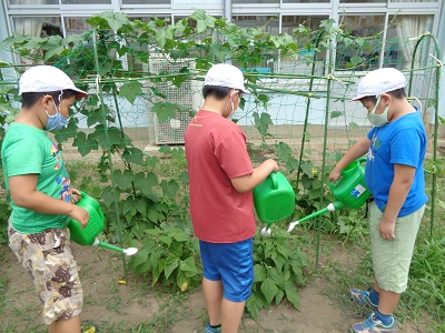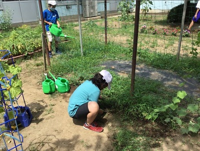 花や野菜に水をあげたり、雑草を抜いたりして、学校の植物を大切に育てています。