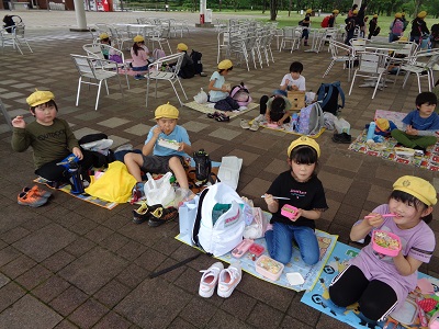 午後は雨がやんだため、外でお弁当を食べることができました。