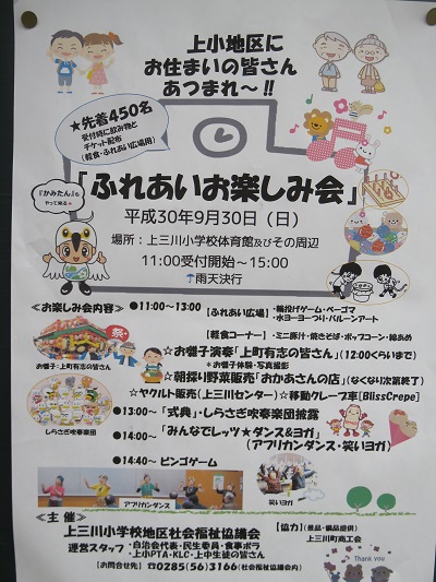 10/6(土)11時~15時まで、上小の体育館周辺で、地区社協主催の「ふれあいお楽しみ会」が行われます。(チラシの日付は、延期前のものです。)