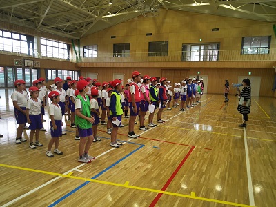 1~6年生のリレーの選手が集まり、チームごとの並び順を確認しました。