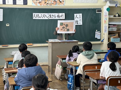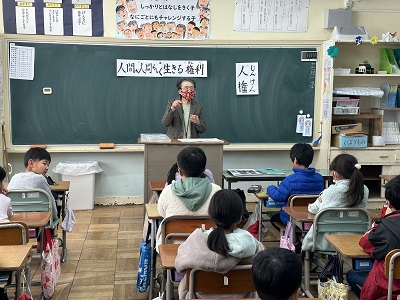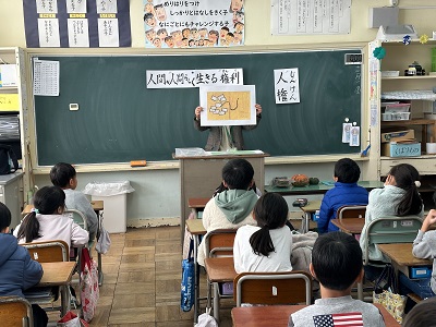 はじめに人権とは、「人間らしく生きる権利」であることを教えていただきました。「人間らしく生きる」とはどういうことなのか、読み聞かせを通して学びました。