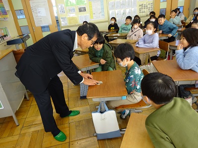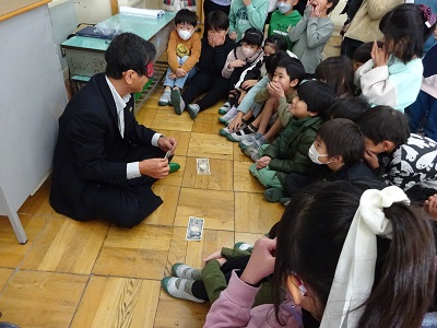 手ざわりで千円札や五千円札、一万円札に分けられることを知り、子どもたちから歓声が上がっていました。