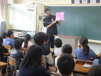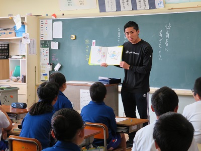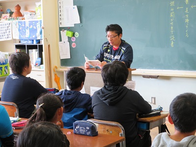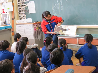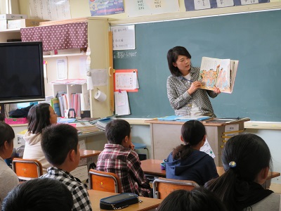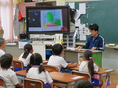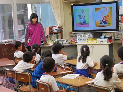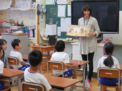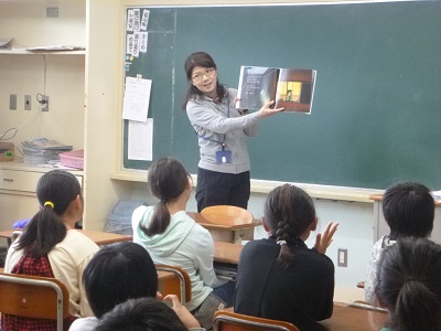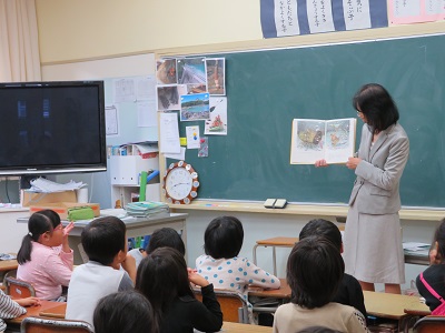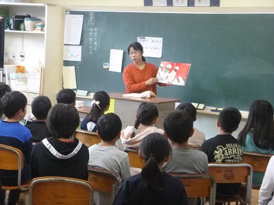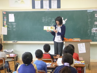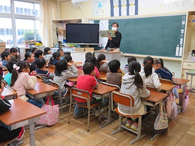 読書週間の水曜日の朝は、ボランティアの方と先生方による読み聞かせです。(全クラス)