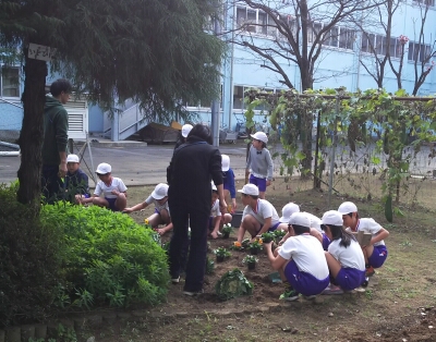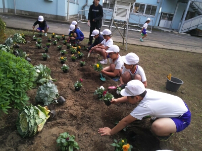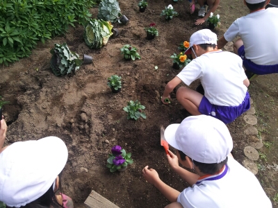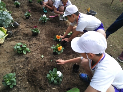 写真は、3年生が中庭の花壇の植え替えをしている様子です。