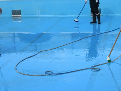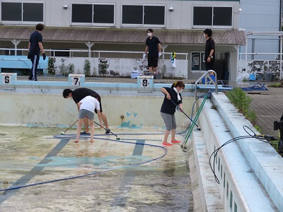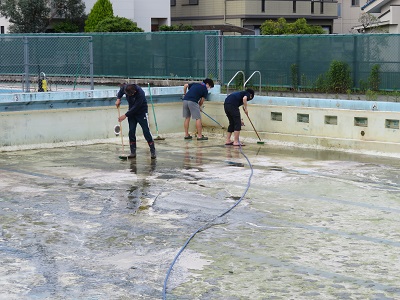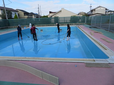 教職員で、プールの中をきれいにしました。